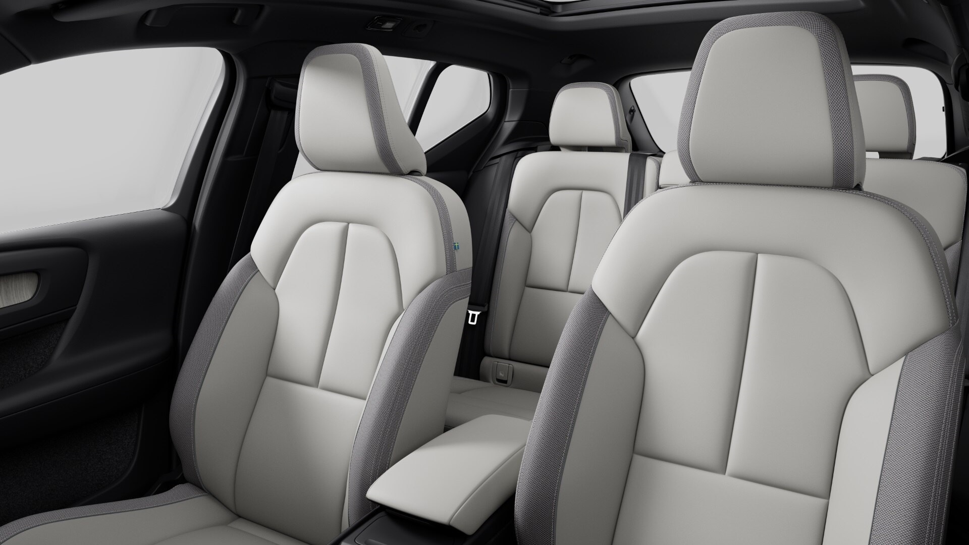Dawn Fusion seat upholstery in a leather-free color-coordinated Charcoal interior with black headliner and contemporary decor for a subtly contrasting three-dimensional effect. Microtech seats have textile inserts with piping to contrast with the smooth seat surfaces.View Volvo EV Inventory